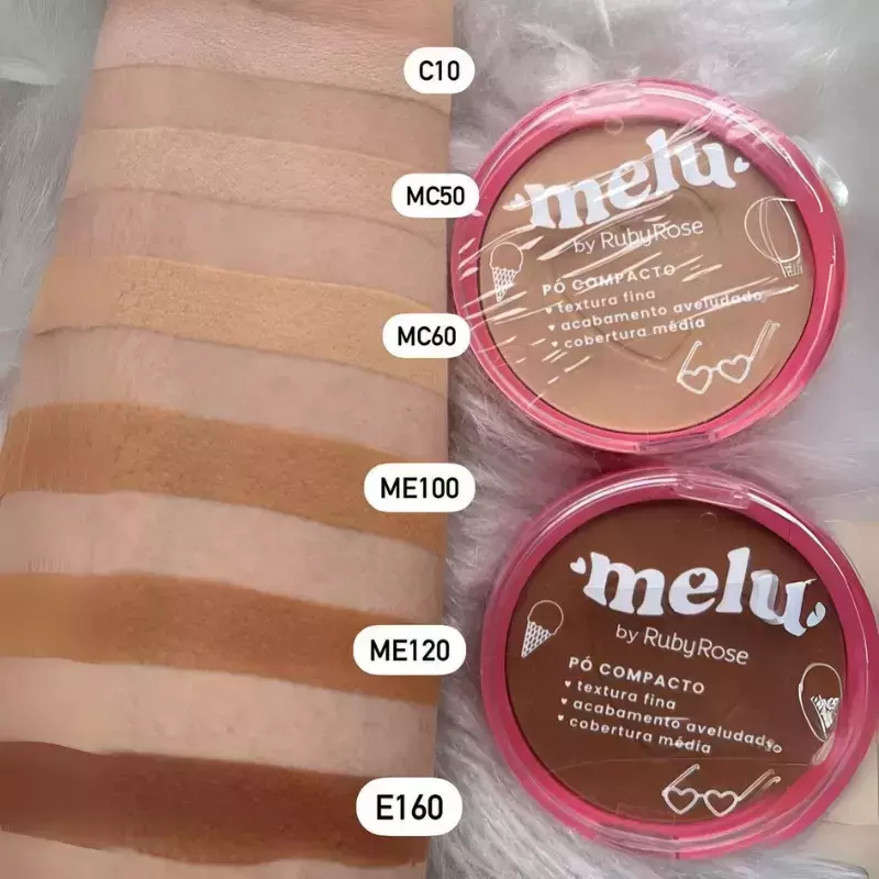 O Pó compacto Melu possui textura fina, acabamento aveludado, cobertura média, você sente que a cor e a textura são reais!